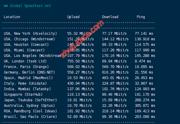 speedtest的国际节点测试结果: