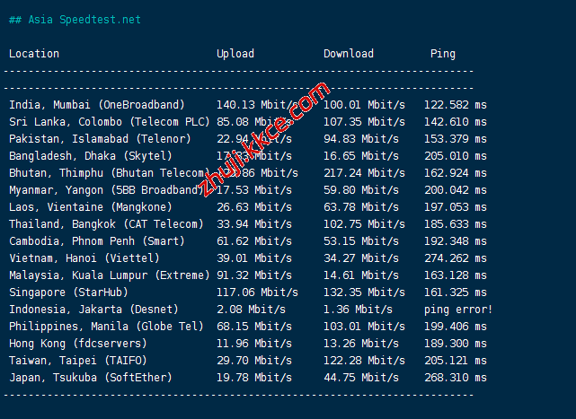 speedtest亚洲区域内的部分节点的测试数据: