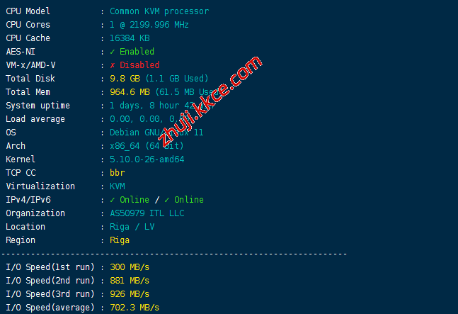 CPU型号未知,主频2.4GHz,启用了BBR,ASN是ITL LLC的,归属地拉脱维亚,当前硬盘I/O大致702MB/S的样子: