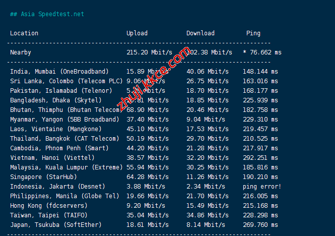 speedtest亚洲区域内的部分节点的测试数据: