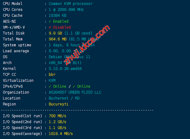 CPU型号未知,主频2.4GHz,启用了BBR,ASN是GREEN FLOID的,归属地罗马尼亚,当前硬盘I/O大致1GB/S的样子: