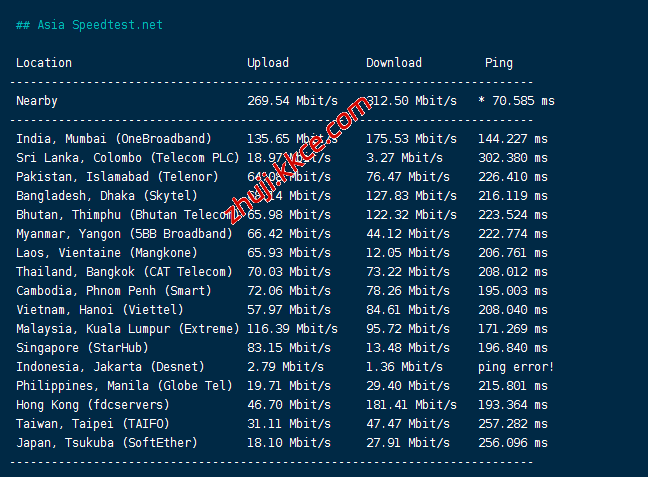 speedtest亚洲区域内的部分节点的测试数据: