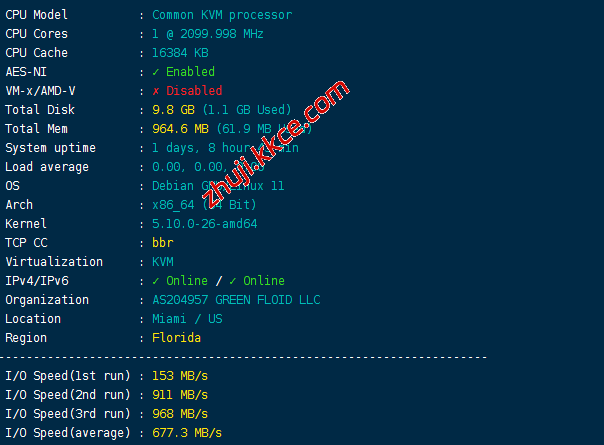 CPU型号未知,主频2.1GHz,启用了BBR,ASN是GREEN FLOID的,归属地美国,当前硬盘I/O大致677MB/S的样子: