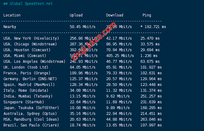 speedtest的国际节点测试结果: