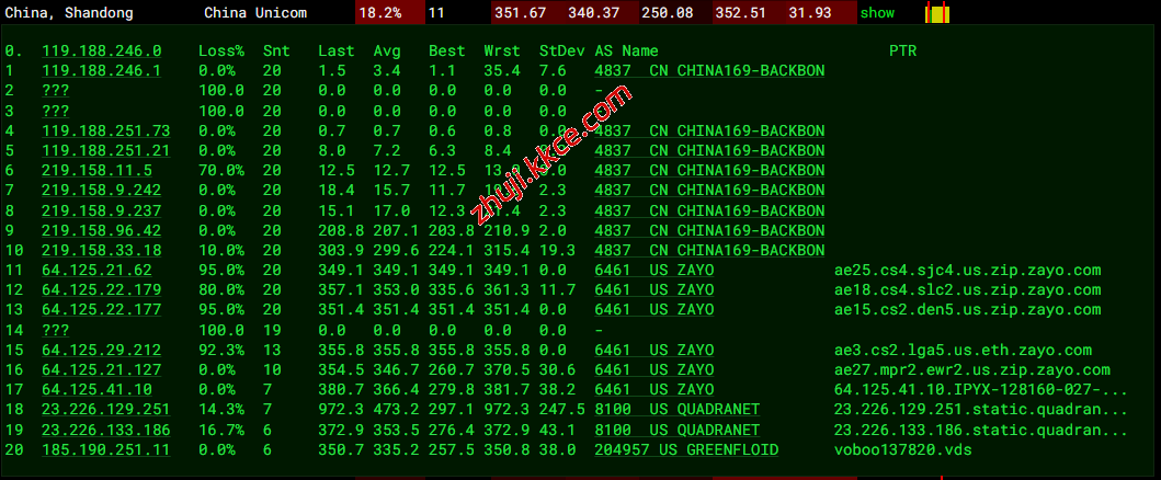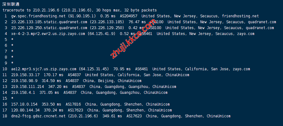 联通回程:走QUADRANET转zayo到美国圣何塞联通节点直连回国