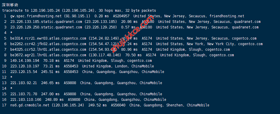 移动回程:走QUADRANET转cogent到英国移动节点回国
