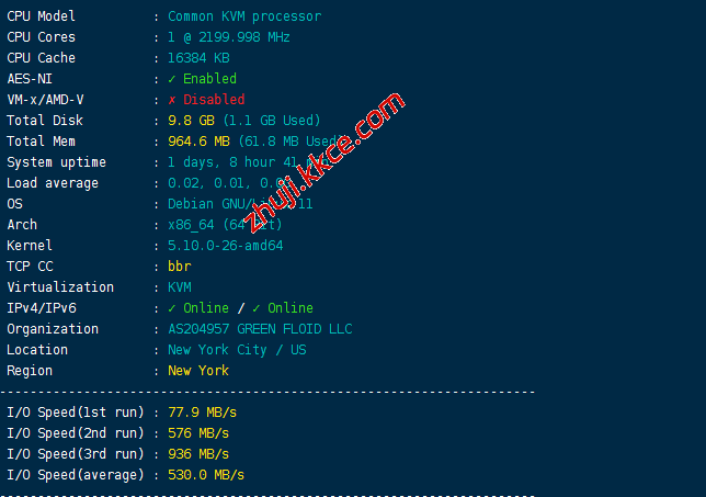 CPU型号未知,主频2.4GHz,启用了BBR,ASN是GREEN FLOID的,归属地美国,当前硬盘I/O大致530MB/S的样子: