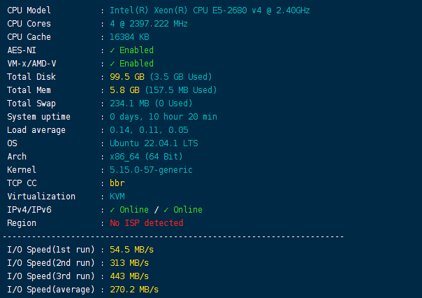 CPU型号Intel(R) Xeon(R) CPU E5-2680 v4,主频2.4GHz,启用了BBR,当前硬盘I/O大致270MB/S的样子: