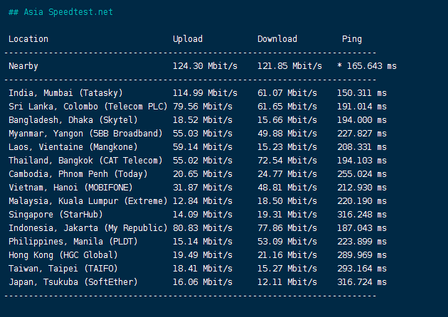 speedtest亚洲区域内的部分节点的测试数据: