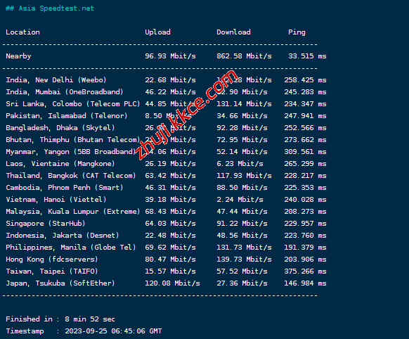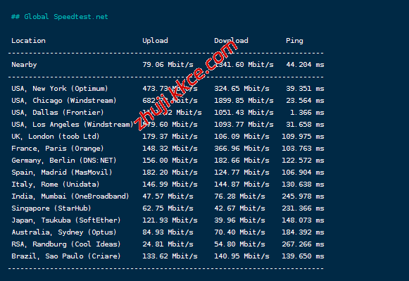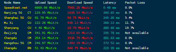 来看看在国内的speedtest.net的节点跑上下行的效果: