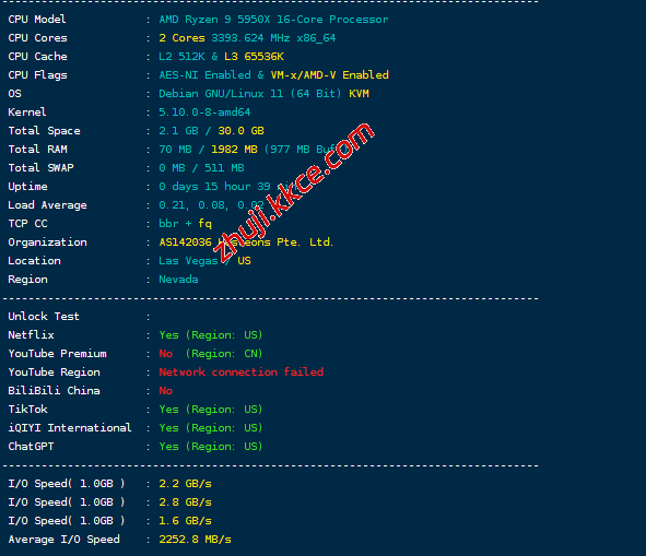 CPU型号已经换成了AMD Ryzen 9 5950X(16核、32线程、主频3.4GHz、加速频率4.9GHz),自家的ASN,启用了BBR,归属地洛杉矶,当前I/O大致2252MB/S的样子: