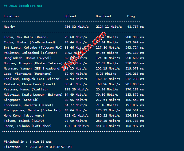 speedtest的部分亚洲区域内的节点的测试效果: