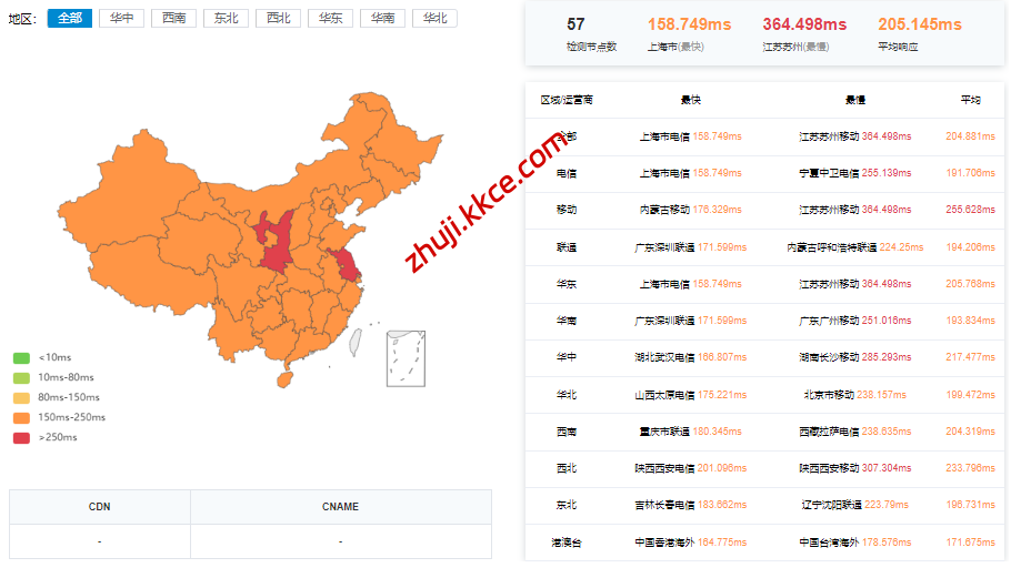 国内三网多节点的延迟测试数据: