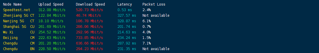 speedtest国内三网节点的实测网络效果: