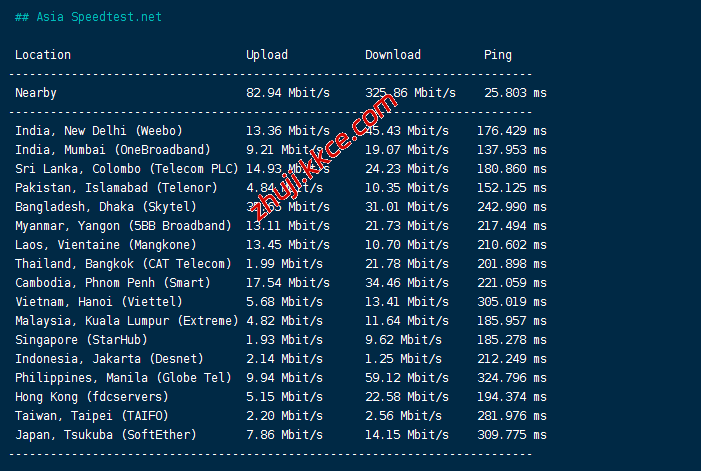 speedtest亚洲区域内内的节点的测试数据: