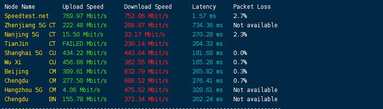 用speedtest.net的国内三网节点测试下上下行带宽,看看能跑多少吧?大致数据如下:
