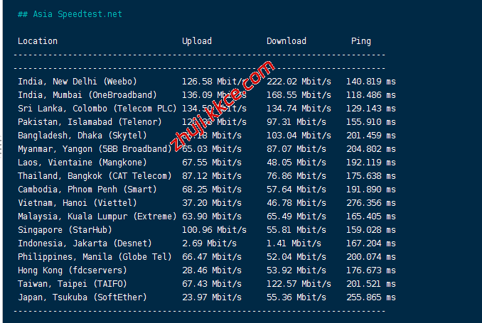 speedtest亚洲区域内的节点,大致数据如下: