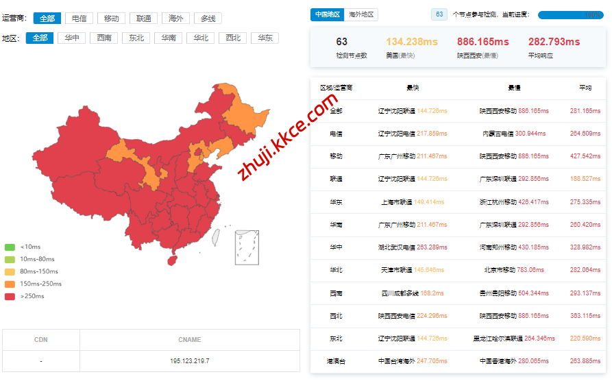 国内三网多个节点的延迟测试数据: